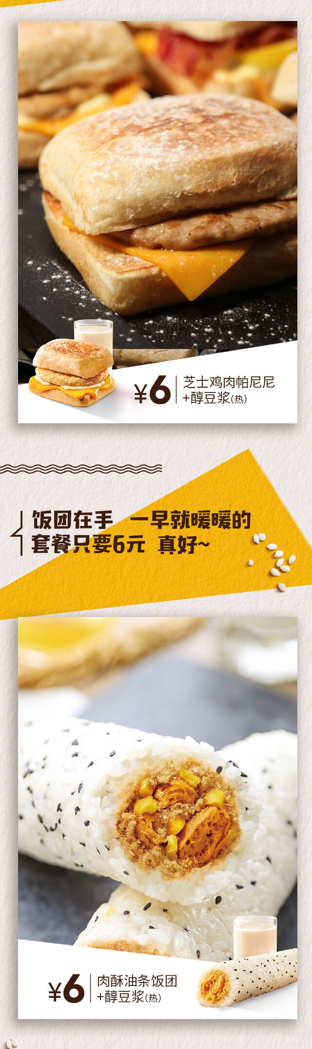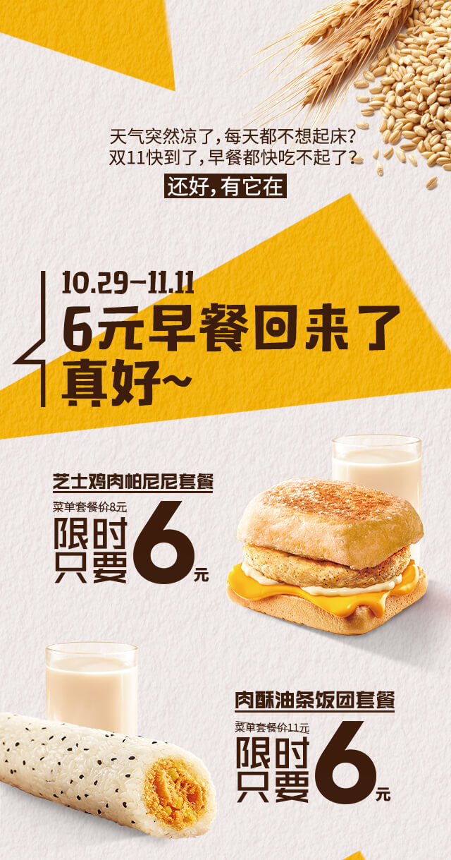 “肯德基6元早餐”活动时间为2018年10月29日至2018年11月11日,仅限6:00-9:30,活动期间到店可以6元优惠价购买指定早餐套餐一份,指定早餐套餐包括:肉酥油条饭团+醇豆浆(热),或芝士鸡肉帕尼尼+醇豆浆(热)。仅限有售6元起早餐套餐的且有此产品供应的肯德基餐厅,部分城市餐厅不供应现磨咖啡,具体情况以餐厅公示为准。不适用于肯德基宅急送。产品及包装以实物为准。不与其他优惠共享。